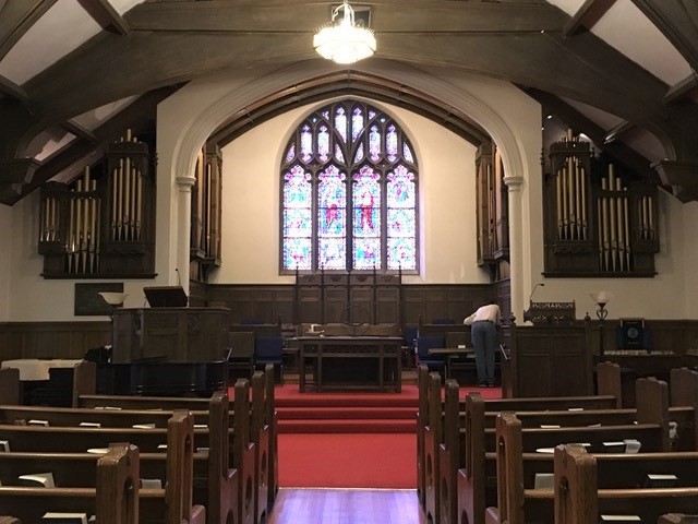 The Winchester Unitarian Society facilities are available for weddings.  In addition to the neo-gothic arches that cross the ceiling of the Sanctuary, we have three very large stained glass windows which let in a kaleidoscope of light.  They are certain to make your wedding a unique and memorable experience.  We also have a more intimate Chapel, featuring more neo-gothic arches and a stained glass window depicting the natural world.
